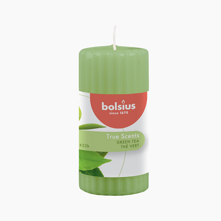 De Bolsius Groene Thee geribbelde geurkaars groen is 12cm hoog en brandt tot wel 33 uur lang. Ontdek deze nieuwe geur van aromatische frisgroene theeblaadjes en een vleugje bergamot. Een verkwikkende geur die je helpt te ontspannen.